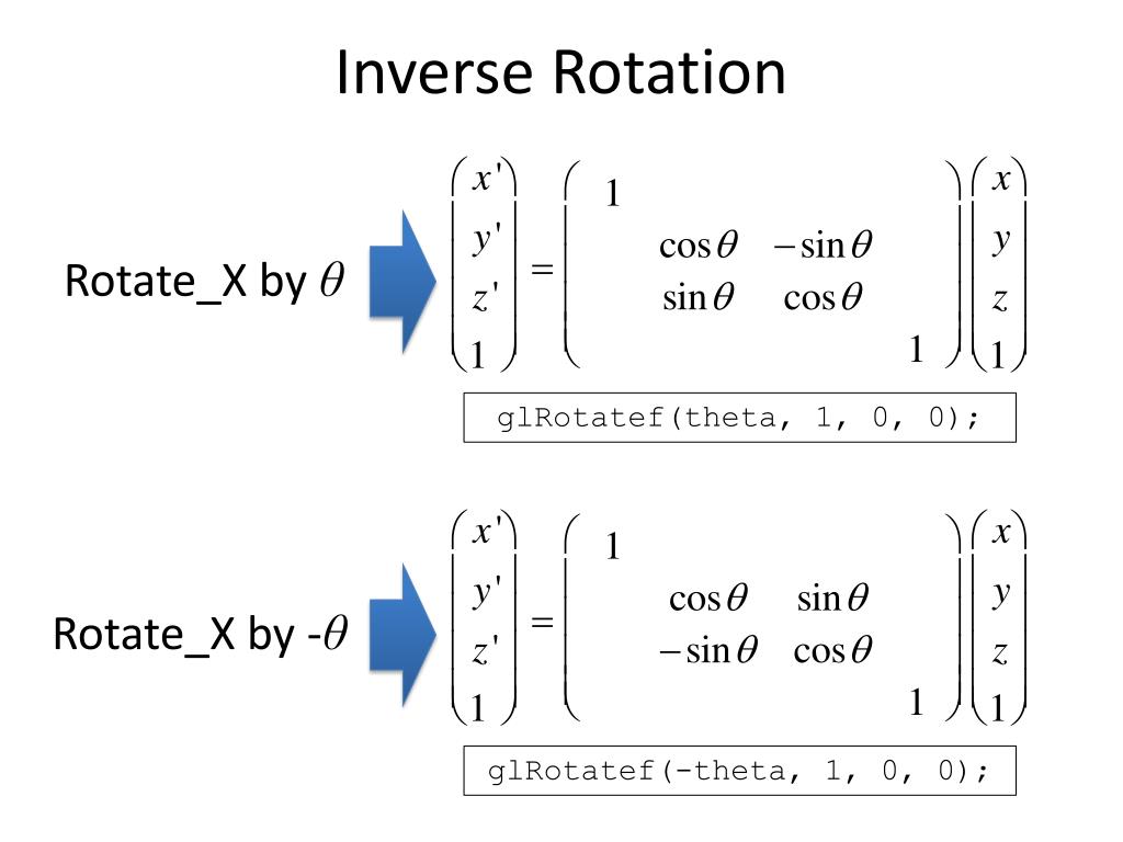 Inverse Rotation Rotate_X by θ glRotatef(theta, 1, 0, 0); Rotate_X by -θ glRotatef(-theta, 1, 0, 0);