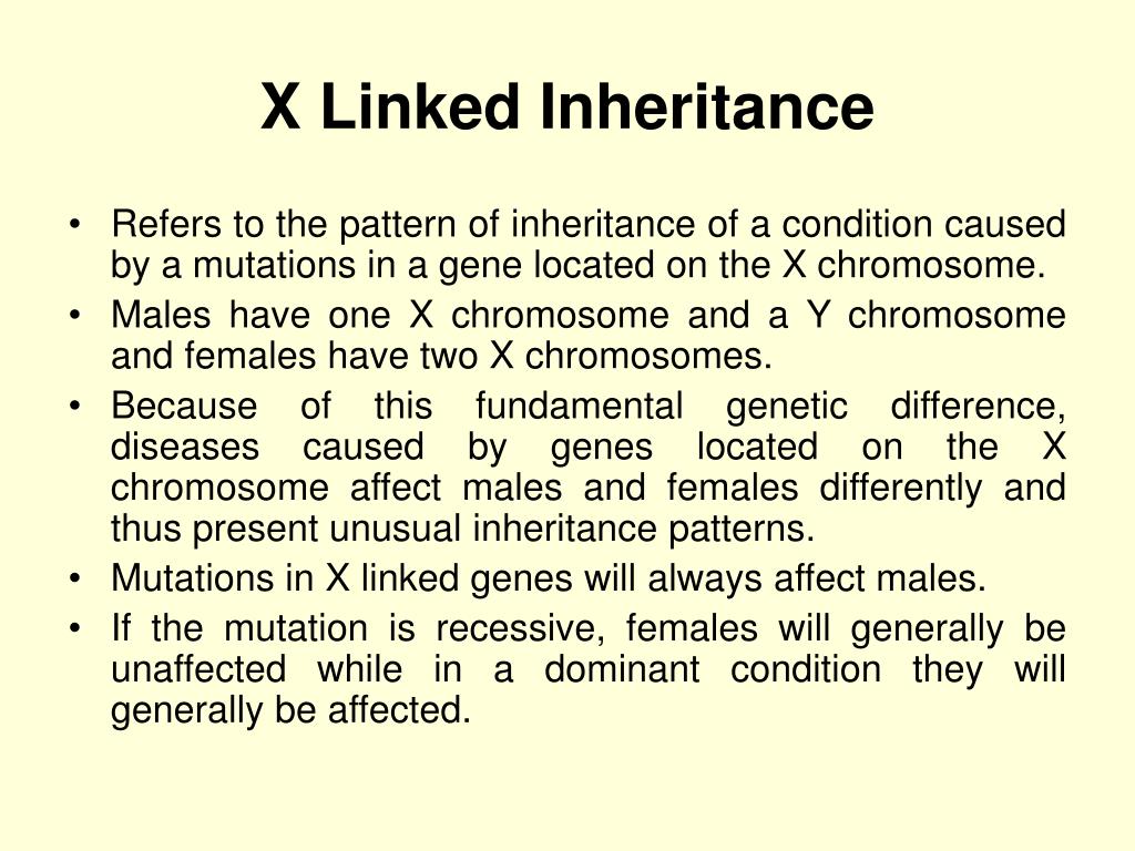 X Linked Inheritance • Refers to the pattern of inheritance of a condition caused by a mutations in a gene located on the X chromosome. • Males have one X chromosome and a Y chromosome and females have two X chromosomes. • Because of this fundamental genetic difference, diseases caused by genes located on the X chromosome affect males and females differently and thus present unusual inheritance patterns. • Mutations in X linked genes will always affect males. • If the mutation is recessive, females will generally be unaffected while in a dominant condition they will generally be affected.