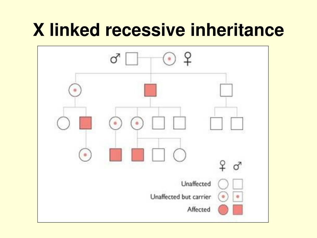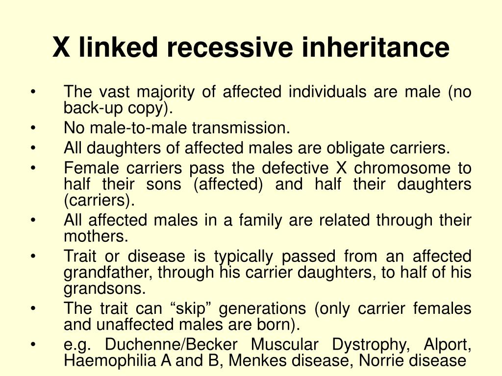 X linked recessive inheritance • The vast majority of affected individuals are male (no back-up copy). • No male-to-male transmission. • All daughters of affected males are obligate carriers. • Female carriers pass the defective X chromosome to half their sons (affected) and half their daughters (carriers). • All affected males in a family are related through their mothers. • Trait or disease is typically passed from an affected grandfather, through his carrier daughters, to half of his grandsons. • The trait can “skip” generations (only carrier females and unaffected males are born). • e.g. Duchenne/Becker Muscular Dystrophy, Alport, Haemophilia A and B, Menkes disease, Norrie disease