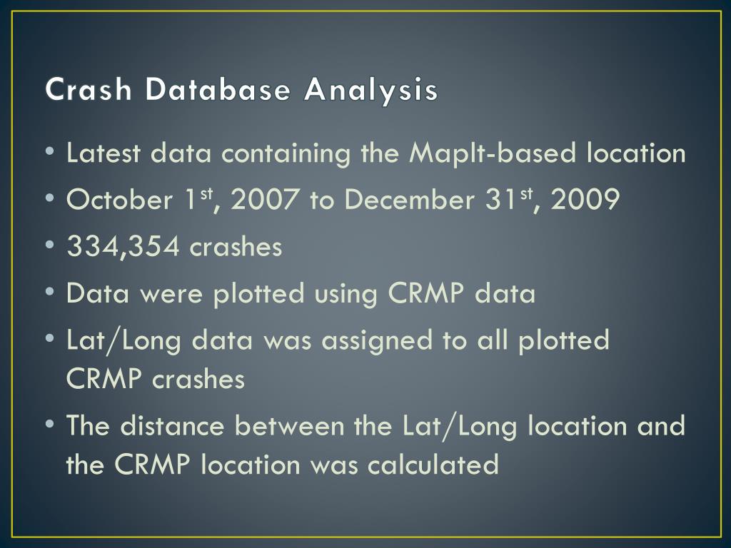 Crash Database Analysis • Latest data containing the MapIt-based location • October 1st, 2007 to December 31st, 2009 • 334,354 crashes • Data were plotted using CRMP data • Lat/Long data was assigned to all plotted CRMP crashes • The distance between the Lat/Long location and the CRMP location was calculated