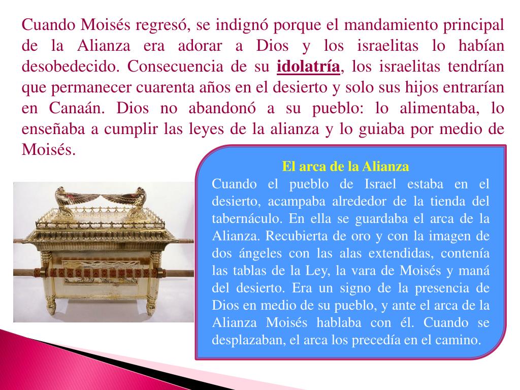 Cuando Moisés regresó, se indignó porque el mandamiento principal de la Alianza era adorar a Dios y los israelitas lo habían desobedecido. Consecuencia de su idolatría, los israelitas tendrían que permanecer cuarenta años en el desierto y solo sus hijos entrarían en Canaán. Dios no abandonó a su pueblo: lo alimentaba, lo enseñaba a cumplir las leyes de la alianza y lo guiaba por medio de Moisés. El arca de la Alianza Cuando el pueblo de Israel estaba en el desierto, acampaba alrededor de la tienda del tabernáculo. En ella se guardaba el arca de la Alianza. Recubierta de oro y con la imagen de dos ángeles con las alas extendidas, contenía las tablas de la Ley, la vara de Moisés y maná del desierto. Era un signo de la presencia de Dios en medio de su pueblo, y ante el arca de la Alianza Moisés hablaba con él. Cuando se desplazaban, el arca los precedía en el camino.