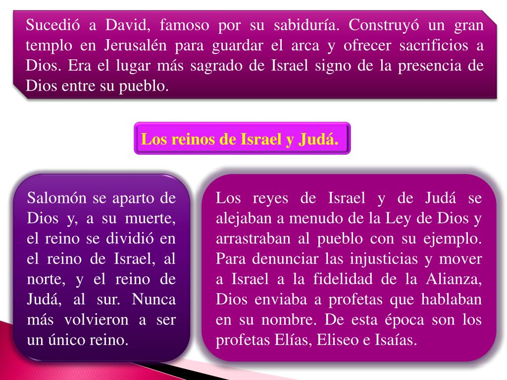 Sucedió a David, famoso por su sabiduría. Construyó un gran templo en Jerusalén para guardar el arca y ofrecer sacrificios a Dios. Era el lugar más sagrado de Israel signo de la presencia de Dios entre su pueblo. Los reinos de Israel y Judá. Salomón se aparto de Dios y, a su muerte, el reino se dividió en el reino de Israel, al norte, y el reino de Judá, al sur. Nunca más volvieron a ser un único reino. Los reyes de Israel y de Judá se alejaban a menudo de la Ley de Dios y arrastraban al pueblo con su ejemplo. Para denunciar las injusticias y mover a Israel a la fidelidad de la Alianza, Dios enviaba a profetas que hablaban en su nombre. De esta época son los profetas Elías, Eliseo e Isaías.