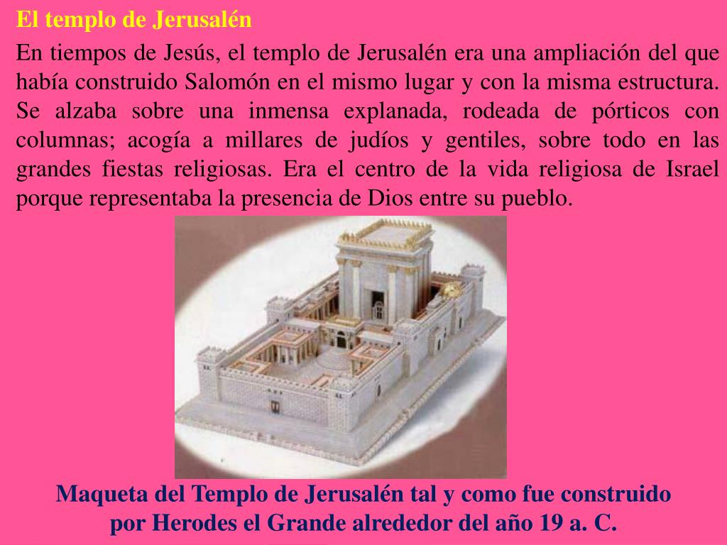 El templo de Jerusalén En tiempos de Jesús, el templo de Jerusalén era una ampliación del que había construido Salomón en el mismo lugar y con la misma estructura. Se alzaba sobre una inmensa explanada, rodeada de pórticos con columnas; acogía a millares de judíos y gentiles, sobre todo en las grandes fiestas religiosas. Era el centro de la vida religiosa de Israel porque representaba la presencia de Dios entre su pueblo. Maqueta del Templo de Jerusalén tal y como fue construido por Herodes el Grande alrededor del año 19 a. C.