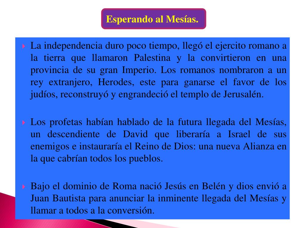 Esperando al Mesías. • La independencia duro poco tiempo, llegó el ejercito romano a la tierra que llamaron Palestina y la convirtieron en una provincia de su gran Imperio. Los romanos nombraron a un rey extranjero, Herodes, este para ganarse el favor de los judíos, reconstruyó y engrandeció el templo de Jerusalén. • Los profetas habían hablado de la futura llegada del Mesías, un descendiente de David que liberaría a Israel de sus enemigos e instauraría el Reino de Dios: una nueva Alianza en la que cabrían todos los pueblos. • Bajo el dominio de Roma nació Jesús en Belén y dios envió a Juan Bautista para anunciar la inminente llegada del Mesías y llamar a todos a la conversión.