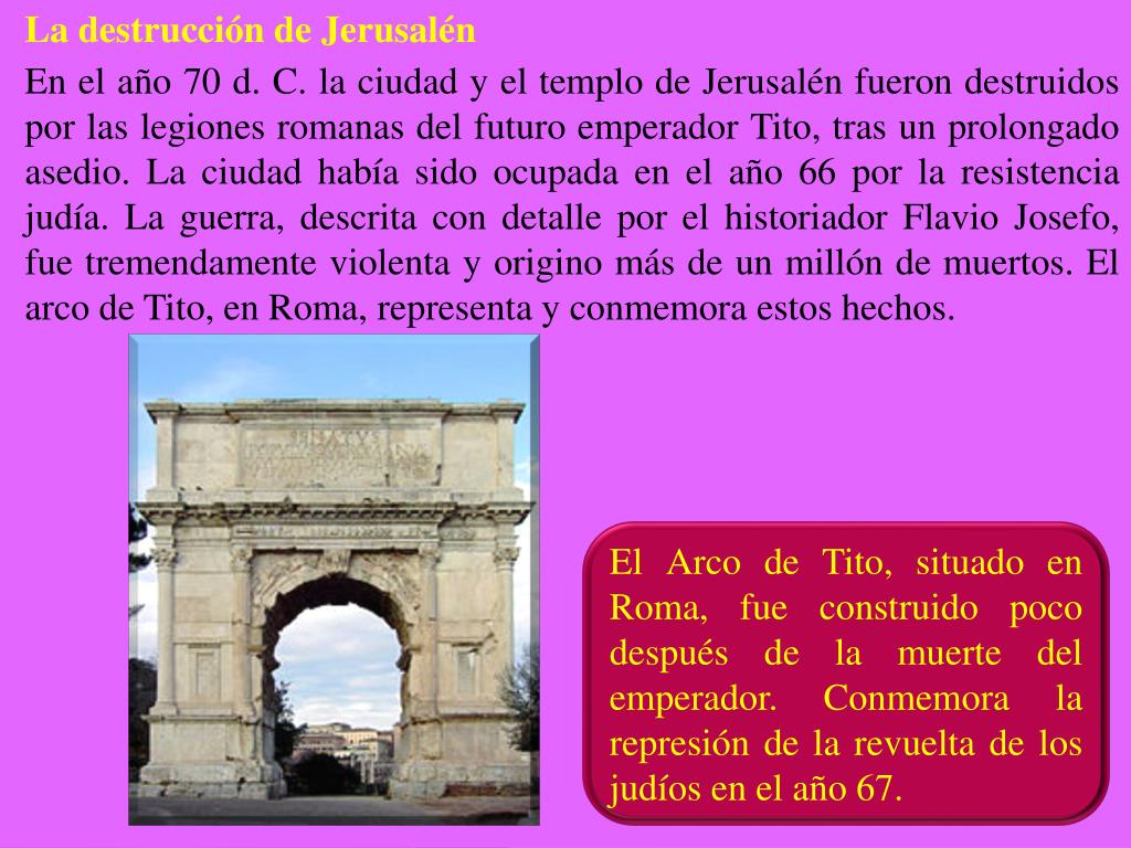 La destrucción de Jerusalén En el año 70 d. C. la ciudad y el templo de Jerusalén fueron destruidos por las legiones romanas del futuro emperador Tito, tras un prolongado asedio. La ciudad había sido ocupada en el año 66 por la resistencia judía. La guerra, descrita con detalle por el historiador Flavio Josefo, fue tremendamente violenta y origino más de un millón de muertos. El arco de Tito, en Roma, representa y conmemora estos hechos. El Arco de Tito, situado en Roma, fue construido poco después de la muerte del emperador. Conmemora la represión de la revuelta de los judíos en el año 67.