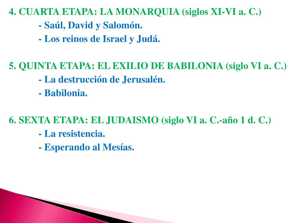 4. CUARTA ETAPA: LA MONARQUIA (siglos XI-VI a. C.) - Saúl, David y Salomón. - Los reinos de Israel y Judá. 5. QUINTA ETAPA: EL EXILIO DE BABILONIA (siglo VI a. C.) - La destrucción de Jerusalén. - Babilonia. 6. SEXTA ETAPA: EL JUDAISMO (siglo VI a. C.-año 1 d. C.) - La resistencia. - Esperando al Mesías.