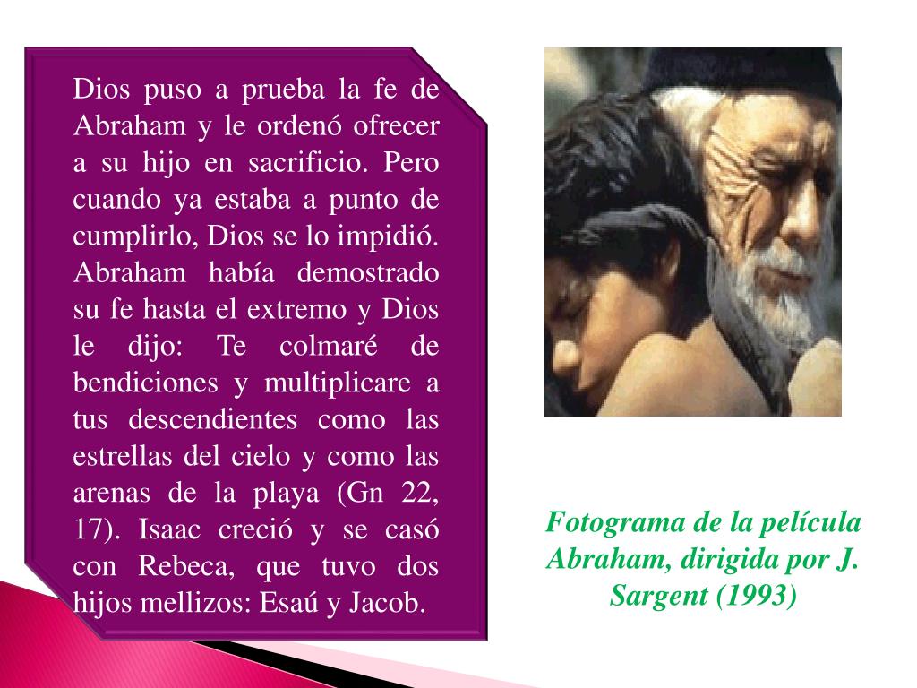 Dios puso a prueba la fe de Abraham y le ordenó ofrecer a su hijo en sacrificio. Pero cuando ya estaba a punto de cumplirlo, Dios se lo impidió. Abraham había demostrado su fe hasta el extremo y Dios le dijo: Te colmaré de bendiciones y multiplicare a tus descendientes como las estrellas del cielo y como las arenas de la playa (Gn 22, 17). Isaac creció y se casó con Rebeca, que tuvo dos hijos mellizos: Esaú y Jacob. Fotograma de la película Abraham, dirigida por J. Sargent (1993)
