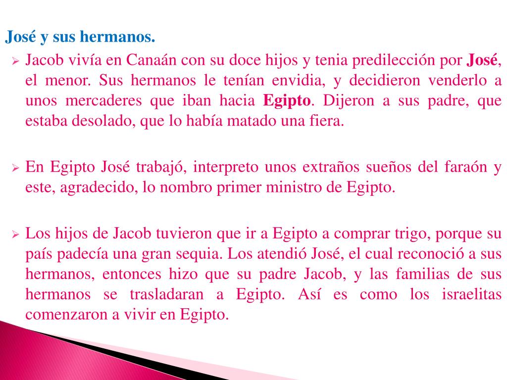 José y sus hermanos. • Jacob vivía en Canaán con su doce hijos y tenia predilección por José, el menor. Sus hermanos le tenían envidia, y decidieron venderlo a unos mercaderes que iban hacia Egipto. Dijeron a sus padre, que estaba desolado, que lo había matado una fiera. • En Egipto José trabajó, interpreto unos extraños sueños del faraón y este, agradecido, lo nombro primer ministro de Egipto. • Los hijos de Jacob tuvieron que ir a Egipto a comprar trigo, porque su país padecía una gran sequia. Los atendió José, el cual reconoció a sus hermanos, entonces hizo que su padre Jacob, y las familias de sus hermanos se trasladaran a Egipto. Así es como los israelitas comenzaron a vivir en Egipto.