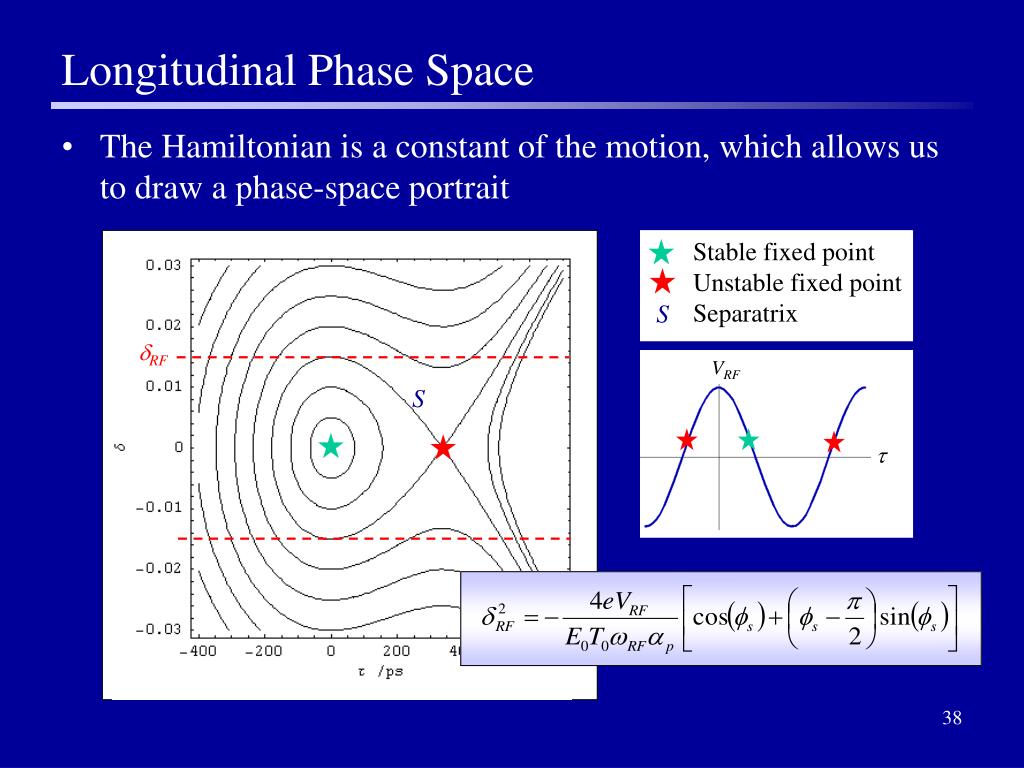 RF VRF Stable fixed point Unstable fixed point Separatrix S S Longitudinal Phase Space • The Hamiltonian is a constant of the motion, which allows us to draw a phase-space portrait