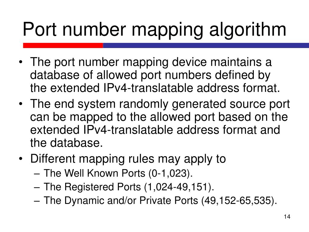 Port number mapping algorithm • The port number mapping device maintains a database of allowed port numbers defined by the extended IPv4-translatable address format. • The end system randomly generated source port can be mapped to the allowed port based on the extended IPv4-translatable address format and the database. • Different mapping rules may apply to • The Well Known Ports (0-1,023). • The Registered Ports (1,024-49,151). • The Dynamic and/or Private Ports (49,152-65,535).