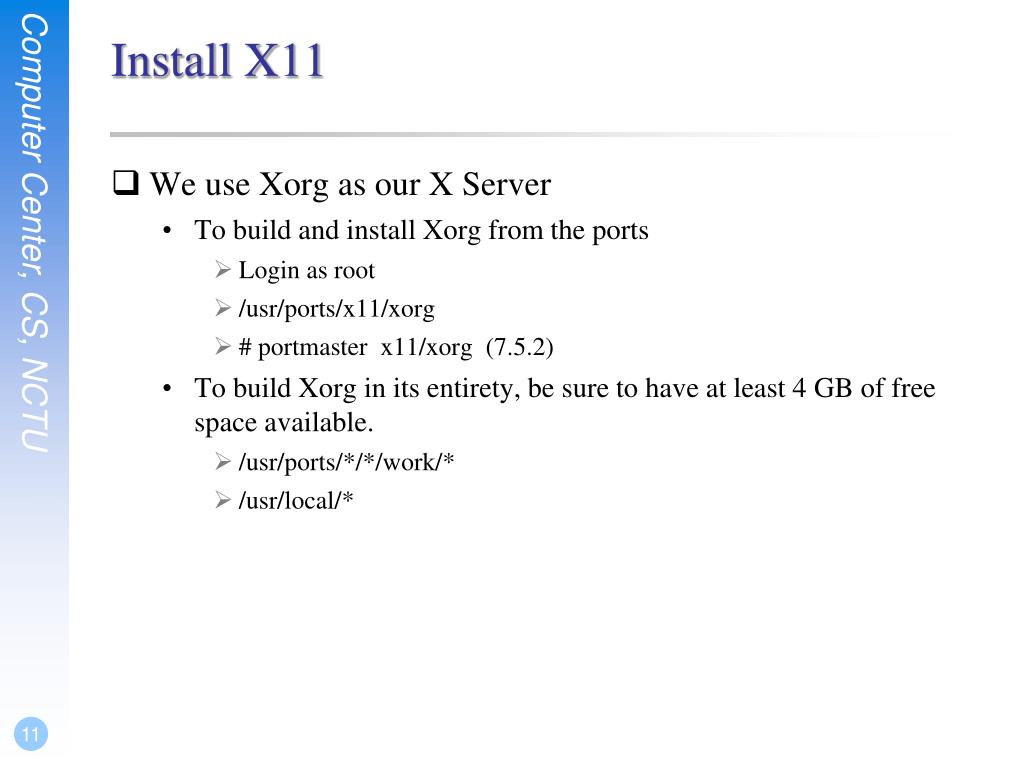 Install X11 • We use Xorg as our X Server • To build and install Xorg from the ports • Login as root • /usr/ports/x11/xorg • # portmaster x11/xorg (7.5.2) • To build Xorg in its entirety, be sure to have at least 4 GB of free space available. • /usr/ports/*/*/work/* • /usr/local/*