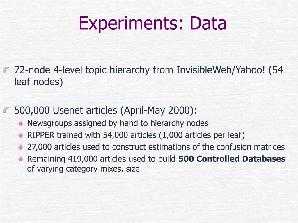 Experiments: Data • 72-node 4-level topic hierarchy from InvisibleWeb/Yahoo! (54 leaf nodes) • 500,000 Usenet articles (April-May 2000): • Newsgroups assigned by hand to hierarchy nodes • RIPPER trained with 54,000 articles (1,000 articles per leaf) • 27,000 articles used to construct estimations of the confusion matrices • Remaining 419,000 articles used to build 500 Controlled Databases of varying category mixes, size