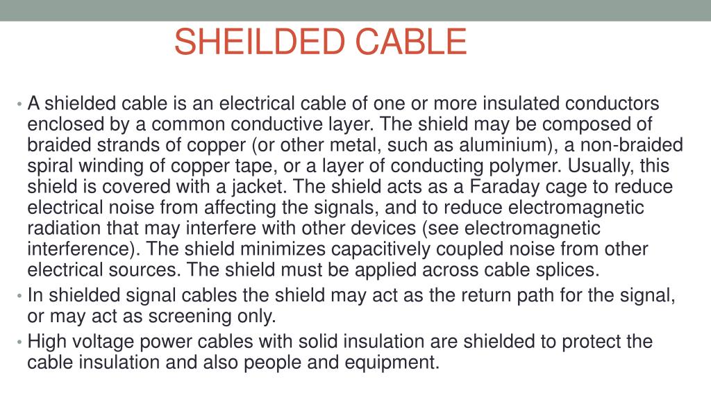 SHEILDED CABLE • A shielded cable is an electrical cable of one or more insulated conductors enclosed by a common conductive layer. The shield may be composed of braided strands of copper (or other metal, such as aluminium), a non-braided spiral winding of copper tape, or a layer of conducting polymer. Usually, this shield is covered with a jacket. The shield acts as a Faraday cage to reduce electrical noise from affecting the signals, and to reduce electromagnetic radiation that may interfere with other devices (see electromagnetic interference). The shield minimizes capacitively coupled noise from other electrical sources. The shield must be applied across cable splices. • In shielded signal cables the shield may act as the return path for the signal, or may act as screening only. • High voltage power cables with solid insulation are shielded to protect the cable insulation and also people and equipment.