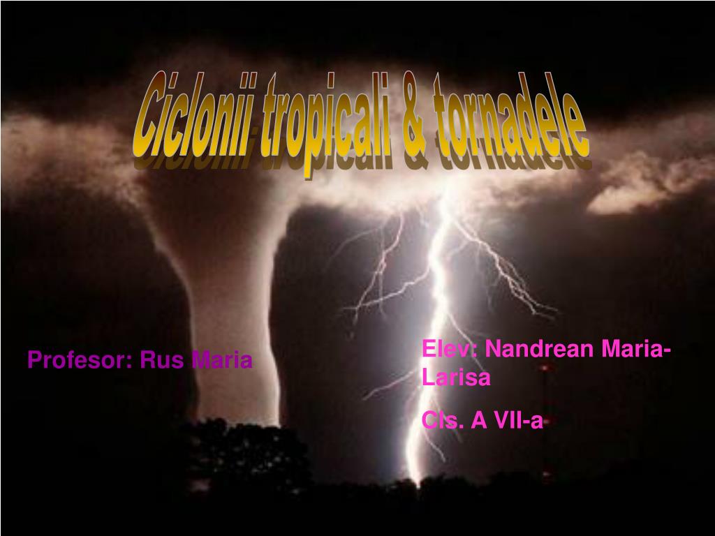 Ciclonii tropicali & tornadele. Elev: Nandrean Maria-Larisa Cls. A VII-a. Profesor: Rus Maria. Ciclonii tropicali. Ciclonii tropicali sunt furtuni violente, formate intre 5-150 lat. N si S, avand viteze ale vantului de peste 118 km/h .