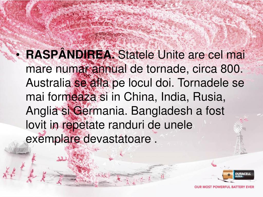 RASPÂNDIREA. Statele Unite are cel mai mare numar annual de tornade, circa 800. Australia se afla pe locul doi. Tornadele se mai formeaza si in China, India, Rusia, Anglia si Germania. Bangladesh a fost lovit in repetate randuri de unele exemplare devastatoare .