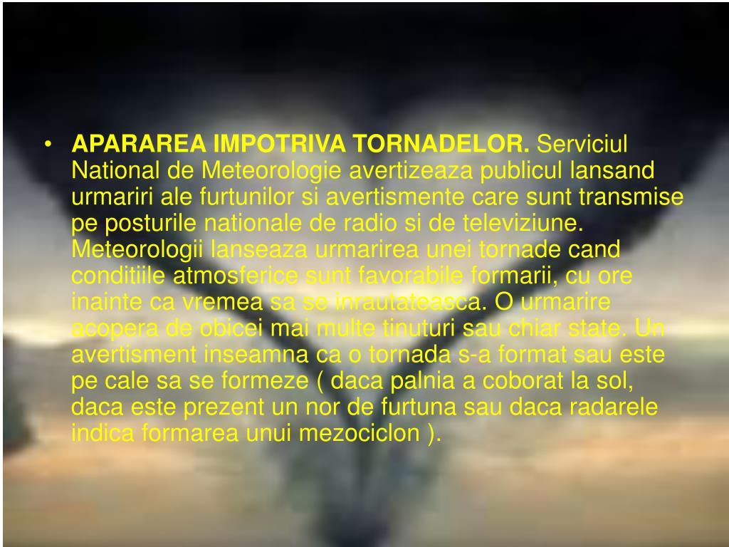 APARAREA IMPOTRIVA TORNADELOR. Serviciul National de Meteorologie avertizeaza publicul lansand urmariri ale furtunilor si avertismente care sunt transmise pe posturile nationale de radio si de televiziune. Meteorologii lanseaza urmarirea unei tornade cand conditiile atmosferice sunt favorabile formarii, cu ore inainte ca vremea sa se inrautateasca. O urmarire acopera de obicei mai multe tinuturi sau chiar state. Un avertisment inseamna ca o tornada s-a format sau este pe cale sa se formeze ( daca palnia a coborat la sol, daca este prezent un nor de furtuna sau daca radarele indica formarea unui mezociclon ).