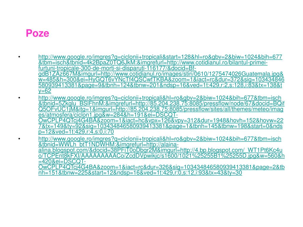 Poze • http://www.google.ro/imgres?q=ciclonii+tropicali&start=128&hl=ro&gbv=2&biw=1024&bih=677&tbm=isch&tbnid=4k2BpaZ0TQ6JkM:&imgrefurl=http://www.cotidianul.ro/bilantul-primei-furtuni-tropicale-300-de-morti-si-disparuti-116177/&docid=Bf-gdB1ZAz667M&imgurl=http://www.cotidianul.ro/images/stiri/0610/1275474026Guatemala.jpg&w=485&h=300&ei=HyGQT6vYNcTf4QSCwfTKBA&zoom=1&iact=rc&dur=372&sig=103434846580939413381&page=9&tbnh=124&tbnw=201&ndsp=16&ved=1t:429,r:2,s:128,i:83&tx=138&ty=62 • http://www.google.ro/imgres?q=ciclonii+tropicali&hl=ro&gbv=2&biw=1024&bih=677&tbm=isch&tbnid=5Zkglu_BSlFhnM:&imgrefurl=http://85.204.238.75:8085/pressflow/node/67&docid=BQifQ5OFvUC1jM&itg=1&imgurl=http://85.204.238.75:8085/pressflow/sites/all/themes/meteo/images/atmosfera/ciclon1.jpg&w=284&h=191&ei=DSCQT-OwCPLP4QTcj4G4BA&zoom=1&iact=hc&vpx=126&vpy=312&dur=1948&hovh=152&hovw=227&tx=149&ty=92&sig=103434846580939413381&page=1&tbnh=145&tbnw=198&start=0&ndsp=12&ved=1t:429,r:4,s:0,i:70 • http://www.google.ro/imgres?q=ciclonii+tropicali&hl=ro&gbv=2&biw=1024&bih=677&tbm=isch&tbnid=WWLh_btT1NDWHM:&imgrefurl=http://alaina-alina.blogspot.com/&docid=38PFiT0oDbgr2M&imgurl=http://4.bp.blogspot.com/_WT1Pt6Kc4uo/TCPEnt8kFXI/AAAAAAAAACo/ZcdDVpwikjc/s1600/1021%25255B1%25255D.jpg&w=560&h=420&ei=DSCQT-OwCPLP4QTcj4G4BA&zoom=1&iact=rc&dur=326&sig=103434846580939413381&page=2&tbnh=151&tbnw=225&start=12&ndsp=16&ved=1t:429,r:0,s:12,i:93&tx=43&ty=30
