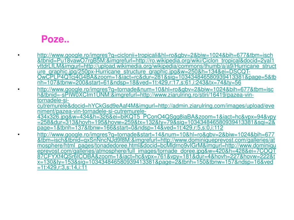 Poze.. • http://www.google.ro/imgres?q=ciclonii+tropicali&hl=ro&gbv=2&biw=1024&bih=677&tbm=isch&tbnid=Pu18vawO7rgB5M:&imgrefurl=http://ro.wikipedia.org/wiki/Ciclon_tropical&docid=2yaI1vttdrLfLM&imgurl=http://upload.wikimedia.org/wikipedia/commons/thumb/a/a9/Hurricane_structure_graphic.jpg/250px-Hurricane_structure_graphic.jpg&w=250&h=134&ei=DSCQT-OwCPLP4QTcj4G4BA&zoom=1&iact=rc&dur=281&sig=103434846580939413381&page=5&tbnh=107&tbnw=200&start=61&ndsp=18&ved=1t:429,r:17,s:61,i:243&tx=74&ty=56 • http://www.google.ro/imgres?q=tornade&num=10&hl=ro&gbv=2&biw=1024&bih=677&tbm=isch&tbnid=-sPIW0XCIm1UNM:&imgrefurl=http://www.ziarulring.ro/stiri/16419/pazea-vin-tornadele-si-cutremurele&docid=hYCkGsd9eAaf4M&imgurl=http://admin.ziarulring.com/images/upload/eveniment/pazea-vin-tornadele-si-cutremurele-434x326.jpg&w=434&h=326&ei=biKQT5_PConO4QSgg8iaBA&zoom=1&iact=hc&vpx=94&vpy=258&dur=313&hovh=195&hovw=259&tx=132&ty=79&sig=103434846580939413381&sqi=2&page=1&tbnh=137&tbnw=166&start=0&ndsp=14&ved=1t:429,r:5,s:0,i:112 • http://www.google.ro/imgres?q=tornade&start=14&num=10&hl=ro&gbv=2&biw=1024&bih=677&tbm=isch&tbnid=qxSnNncNJd9f8M:&imgrefurl=http://www.dominiqueprevost.com/galleries/atmosphere/html_pages/tonadedoree.html&docid=bcMldrno9vIGrM&imgurl=http://www.dominiqueprevost.com/galleries/atmosphere/full_images/tornade_doree.jpg&w=420&h=428&ei=7COQT87CFYXf4QSr6ICOBA&zoom=1&iact=hc&vpx=761&vpy=181&dur=4&hovh=227&hovw=222&tx=130&ty=153&sig=103434846580939413381&page=2&tbnh=150&tbnw=157&ndsp=16&ved=1t:429,r:3,s:14,i:11