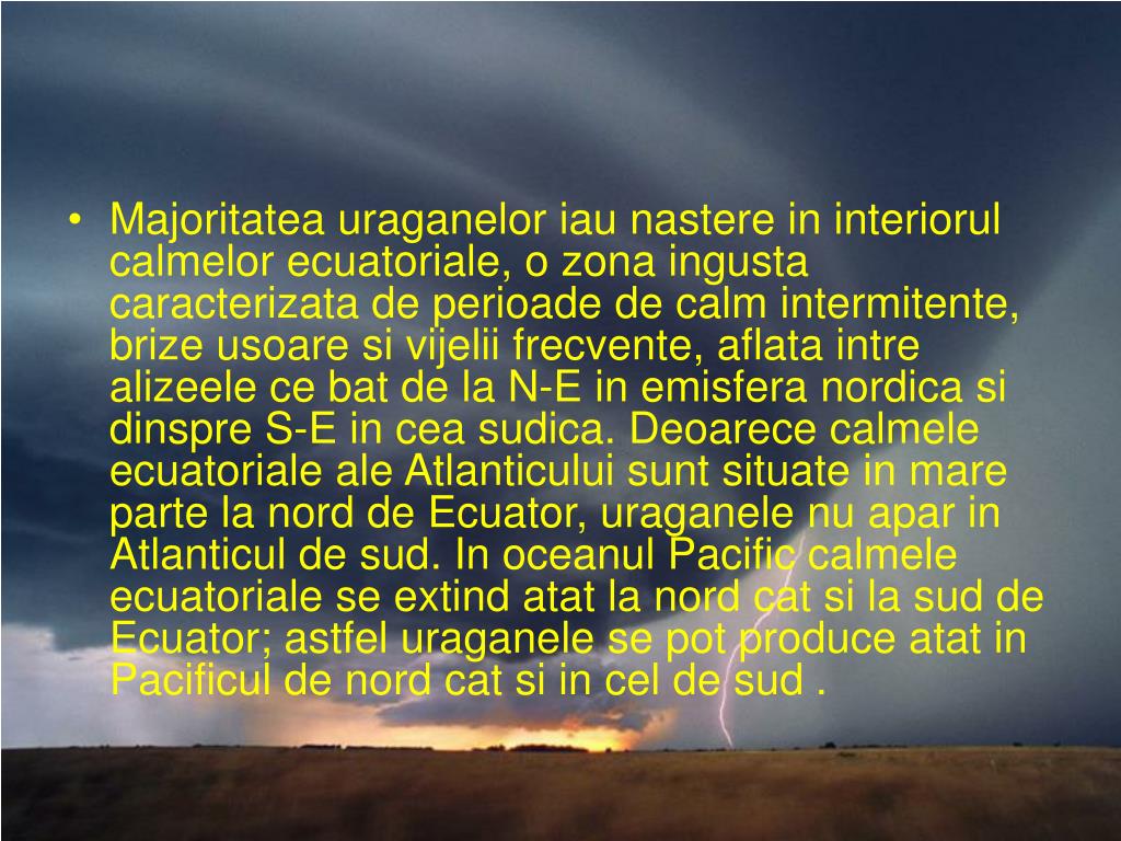 Majoritatea uraganelor iau nastere in interiorul calmelor ecuatoriale, o zona ingusta caracterizata de perioade de calm intermitente, brize usoare si vijelii frecvente, aflata intre alizeele ce bat de la N-E in emisfera nordica si dinspre S-E in cea sudica. Deoarece calmele ecuatoriale ale Atlanticului sunt situate in mare parte la nord de Ecuator, uraganele nu apar in Atlanticul de sud. In oceanul Pacific calmele ecuatoriale se extind atat la nord cat si la sud de Ecuator; astfel uraganele se pot produce atat in Pacificul de nord cat si in cel de sud .