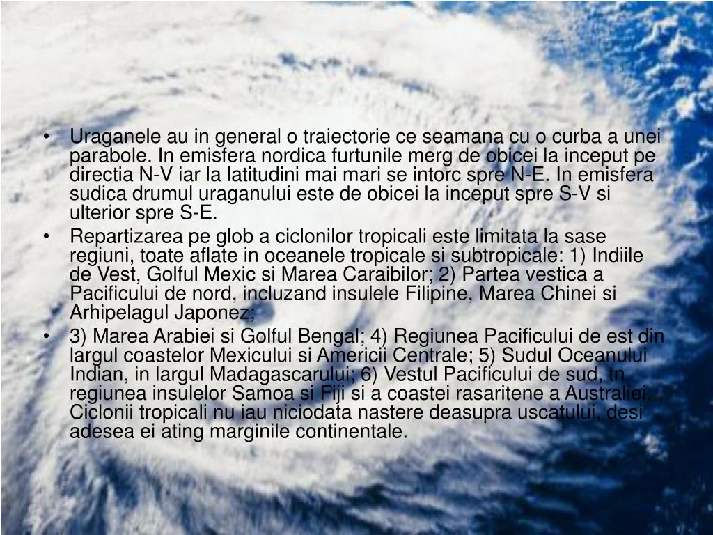 Uraganele au in general o traiectorie ce seamana cu o curba a unei parabole. In emisfera nordica furtunile merg de obicei la inceput pe directia N-V iar la latitudini mai mari se intorc spre N-E. In emisfera sudica drumul uraganului este de obicei la inceput spre S-V si ulterior spre S-E. • Repartizarea pe glob a ciclonilor tropicali este limitata la sase regiuni, toate aflate in oceanele tropicale si subtropicale: 1) Indiile de Vest, Golful Mexic si Marea Caraibilor; 2) Partea vestica a Pacificului de nord, incluzand insulele Filipine, Marea Chinei si Arhipelagul Japonez; • 3) Marea Arabiei si Golful Bengal; 4) Regiunea Pacificului de est din largul coastelor Mexicului si Americii Centrale; 5) Sudul Oceanului Indian, in largul Madagascarului; 6) Vestul Pacificului de sud, tn regiunea insulelor Samoa si Fiji si a coastei rasaritene a Australiei. Ciclonii tropicali nu iau niciodata nastere deasupra uscatului, desi adesea ei ating marginile continentale.