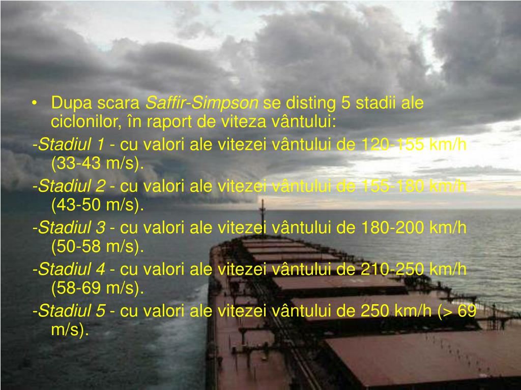 Dupa scara Saffir-Simpson se disting 5 stadii ale ciclonilor, în raport de viteza vântului: -Stadiul 1 - cu valori ale vitezei vântului de 120-155 km/h (33-43 m/s). -Stadiul 2 - cu valori ale vitezei vântului de 155-180 km/h (43-50 m/s). -Stadiul 3 - cu valori ale vitezei vântului de 180-200 km/h (50-58 m/s). -Stadiul 4 - cu valori ale vitezei vântului de 210-250 km/h (58-69 m/s). -Stadiul 5 - cu valori ale vitezei vântului de 250 km/h (> 69 m/s).