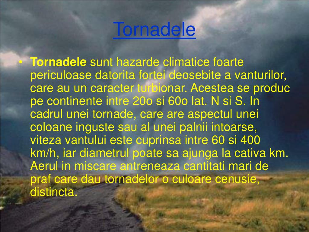 Tornadele • Tornadele sunt hazarde climatice foarte periculoase datorita fortei deosebite a vanturilor, care au un caracter turbionar. Acestea se produc pe continente intre 20o si 60o lat. N si S. In cadrul unei tornade, care are aspectul unei coloane inguste sau al unei palnii intoarse, viteza vantului este cuprinsa intre 60 si 400 km/h, iar diametrul poate sa ajunga la cativa km. Aerul in miscare antreneaza cantitati mari de praf care dau tornadelor o culoare cenusie, distincta.