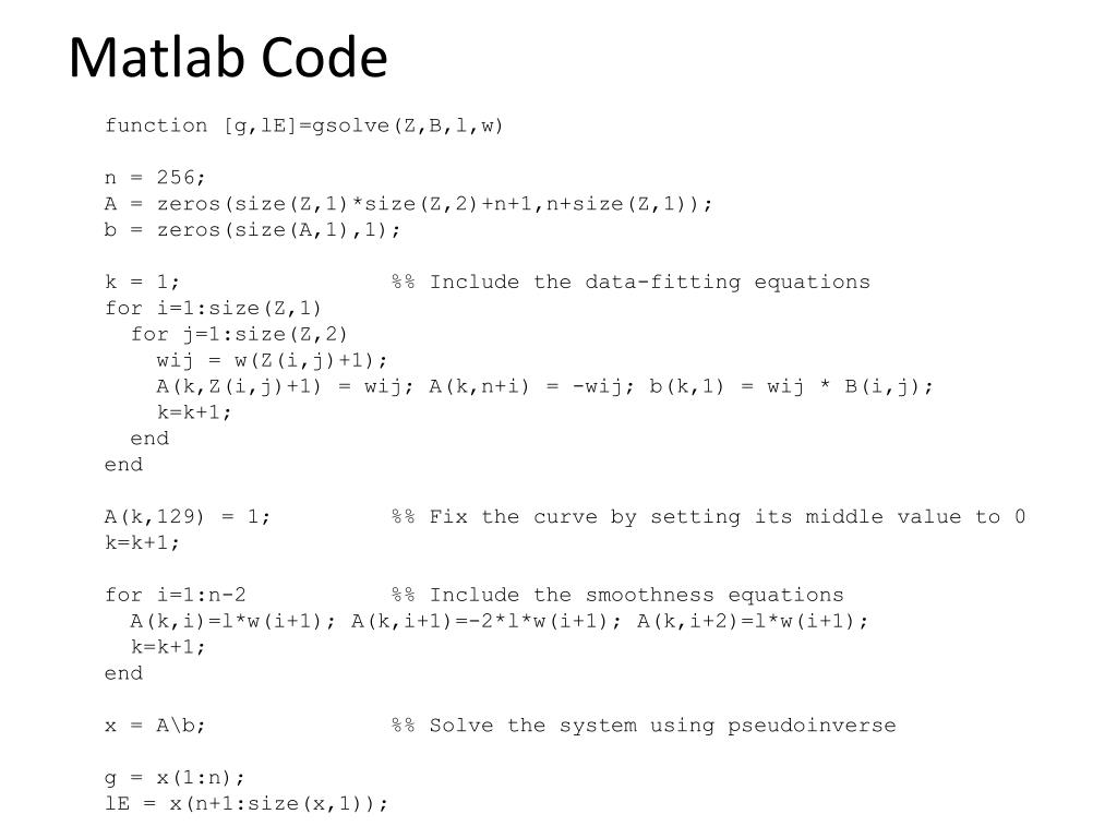 Matlab Code function [g,lE]=gsolve(Z,B,l,w) n = 256; A = zeros(size(Z,1)*size(Z,2)+n+1,n+size(Z,1)); b = zeros(size(A,1),1); k = 1; %% Include the data-fitting equations for i=1:size(Z,1) for j=1:size(Z,2) wij = w(Z(i,j)+1); A(k,Z(i,j)+1) = wij; A(k,n+i) = -wij; b(k,1) = wij * B(i,j); k=k+1; end end A(k,129) = 1; %% Fix the curve by setting its middle value to 0 k=k+1; for i=1:n-2 %% Include the smoothness equations A(k,i)=l*w(i+1); A(k,i+1)=-2*l*w(i+1); A(k,i+2)=l*w(i+1); k=k+1; end x = A\b; %% Solve the system using pseudoinverse g = x(1:n); lE = x(n+1:size(x,1));