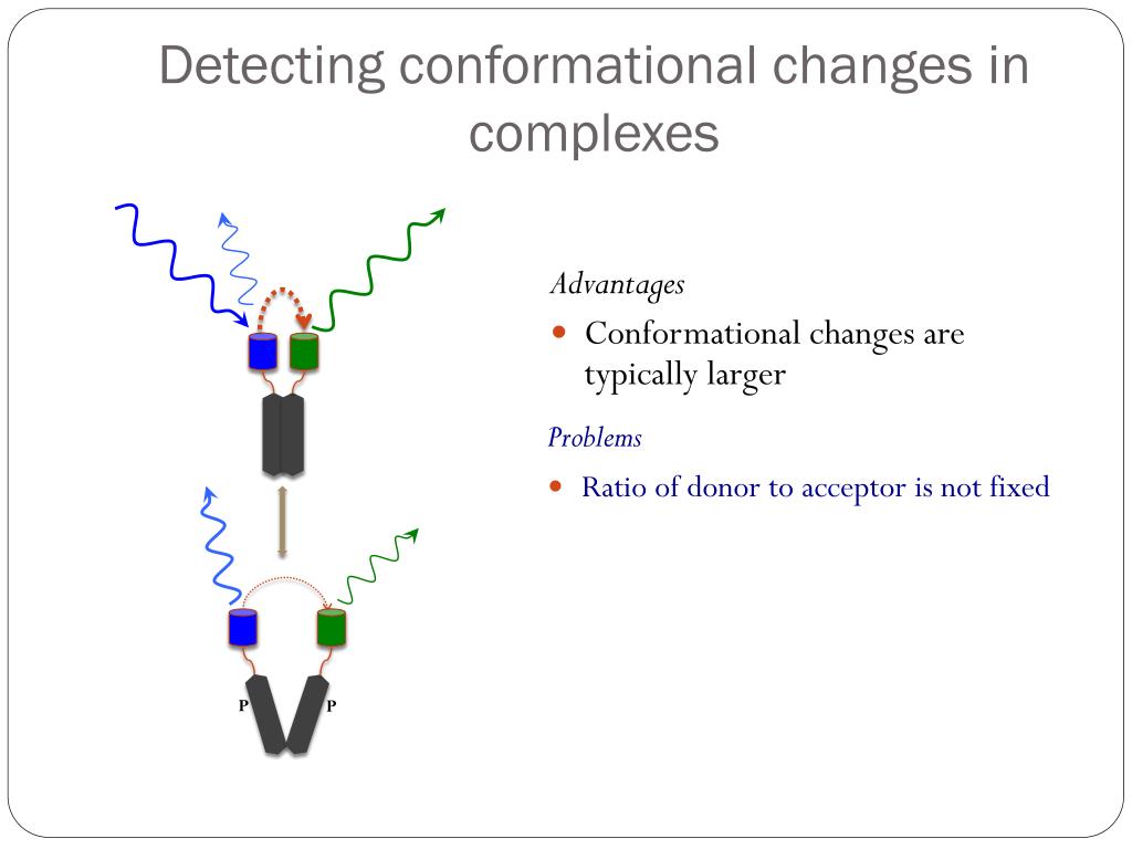 Detectingconformationalchanges in complexes • Advantages • Conformationalchangesaretypically larger • Problems • Ratio of donor to acceptorisnotfixed P P