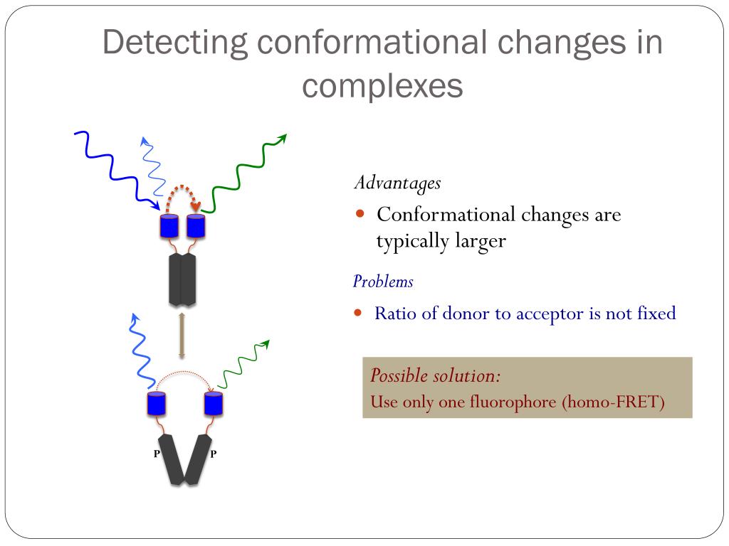 Detectingconformationalchanges in complexes • Advantages • Conformationalchangesaretypically larger • Problems • Ratio of donor to acceptorisnotfixed Possiblesolution: Useonlyonefluorophore (homo-FRET) P P