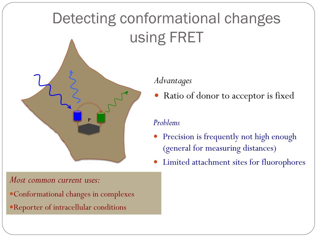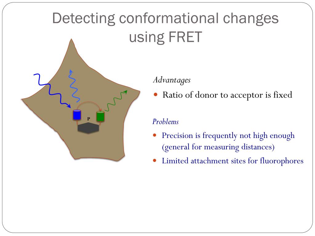 Detectingconformationalchangesusing FRET • Advantages • Ratio of donor to acceptorisfixed P • Problems • Precisionisfrequentlynot high enough (generalformeasuringdistances) • Limitedattachmentsitesforfluorophores