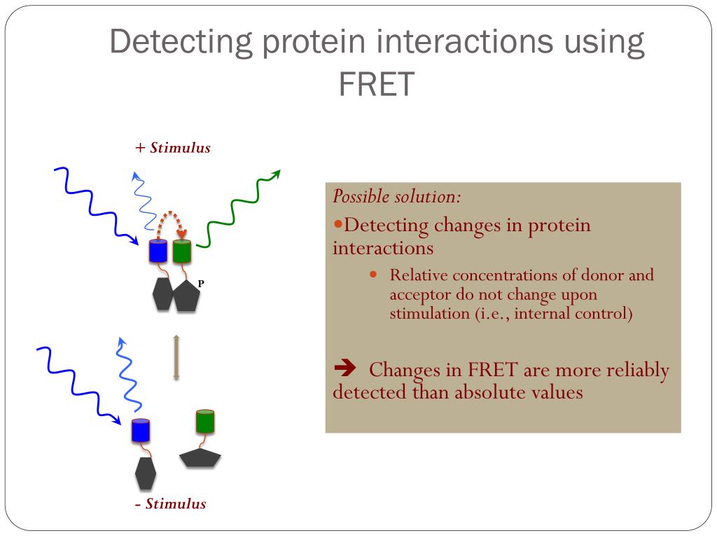 Detectingproteininteractionsusing FRET + Stimulus • Possible solution: • Detecting changes in protein interactions • Relative concentrations of donor and acceptor do not change upon stimulation (i.e., internal control) • Changes in FRET are more reliably detected than absolute values P - Stimulus