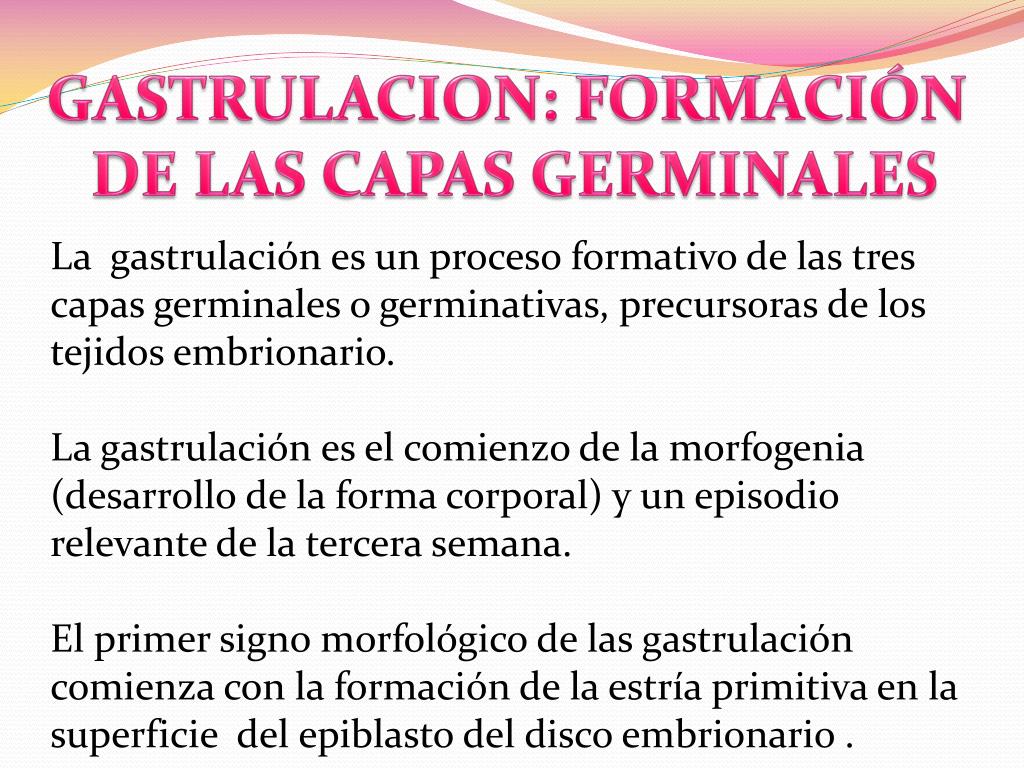 GASTRULACION: FORMACIÓN DE LAS CAPAS GERMINALES La gastrulación es un proceso formativo de las tres capas germinales o germinativas, precursoras de los tejidos embrionario. La gastrulación es el comienzo de la morfogenia (desarrollo de la forma corporal) y un episodio relevante de la tercera semana. El primer signo morfológico de las gastrulación comienza con la formación de la estría primitiva en la superficie del epiblasto del disco embrionario .