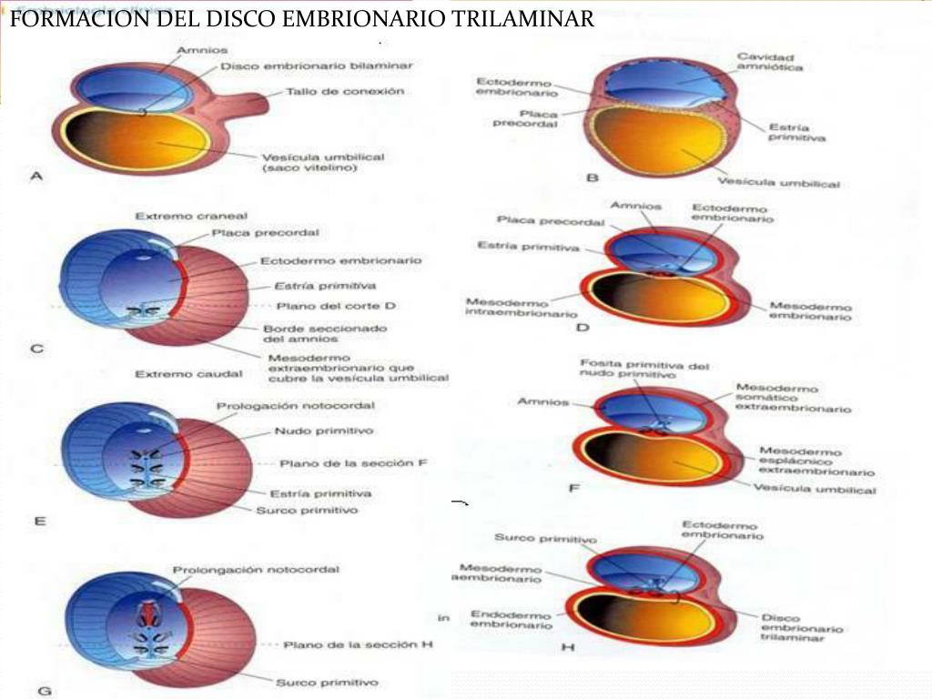 Cada una de las tres capas germinativas (ectodermo, mesodermo y endodermo) da origen y órganos específicos: • Endodermo embrionario da lugar a la epidermis, los sistemas nerviosos central y periférico, los ojos y los oídos internos, la cresta neural y tejidos conjuntivos. • Endodermo embrionario es el origen de los revestimientos epiteliales de las vías respiratorias y alimentarias, células glandulares de los órganos asociados como el hígado y el páncreas. • Mesodermo embrionario da lugar a todos los músculos esqueléticos, las células sanguíneas y el revestimiento de los vasos sanguíneos, todas las capas musculares, revestimientos sedosos de conductos y órganos