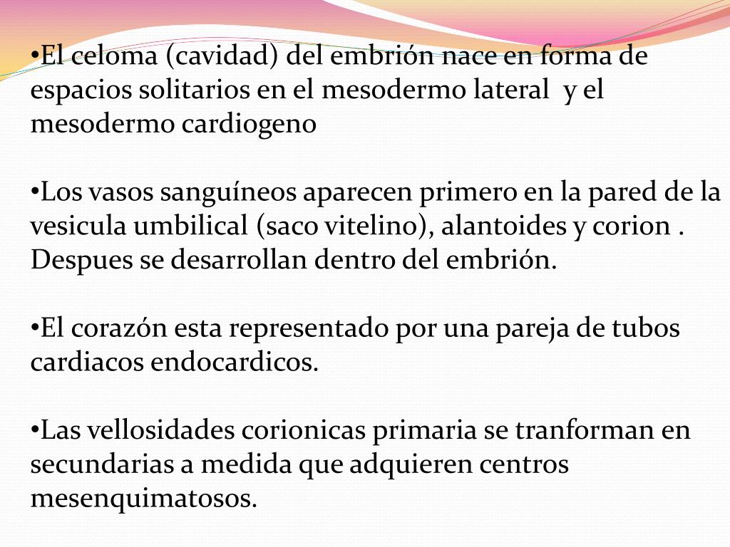 El celoma (cavidad) del embrión nace en forma de espacios solitarios en el mesodermo lateral y el mesodermo cardiogeno • Los vasos sanguíneos aparecen primero en la pared de la vesicula umbilical (saco vitelino), alantoides y corion . Despues se desarrollan dentro del embrión. • El corazón esta representado por una pareja de tubos cardiacos endocardicos. • Las vellosidades corionicas primaria se tranforman en secundarias a medida que adquieren centros mesenquimatosos.