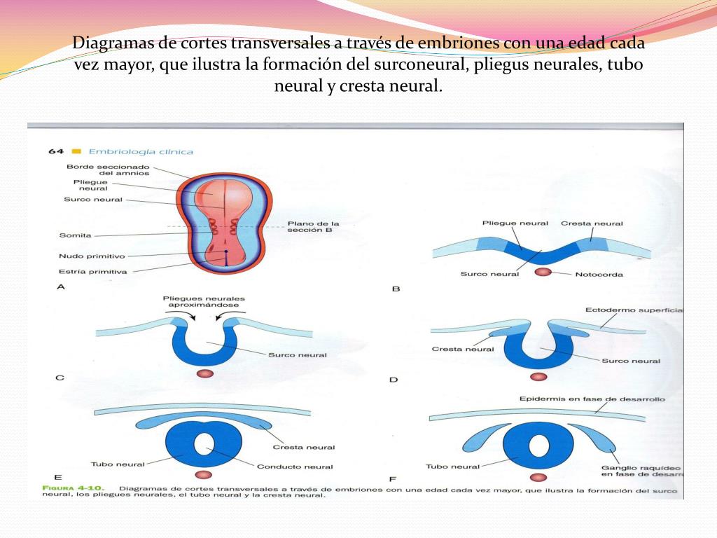 Diagramas de cortes transversales a través de embriones con una edad cada vez mayor, que ilustra la formación del surconeural, pliegus neurales, tubo neural y cresta neural.