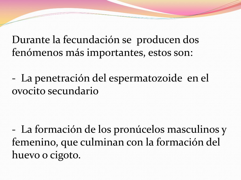 Durante la fecundación se producen dos fenómenos más importantes, estos son: - La penetración del espermatozoide en el ovocito secundario - La formación de los pronúcelos masculinos y femenino, que culminan con la formación del huevo o cigoto.