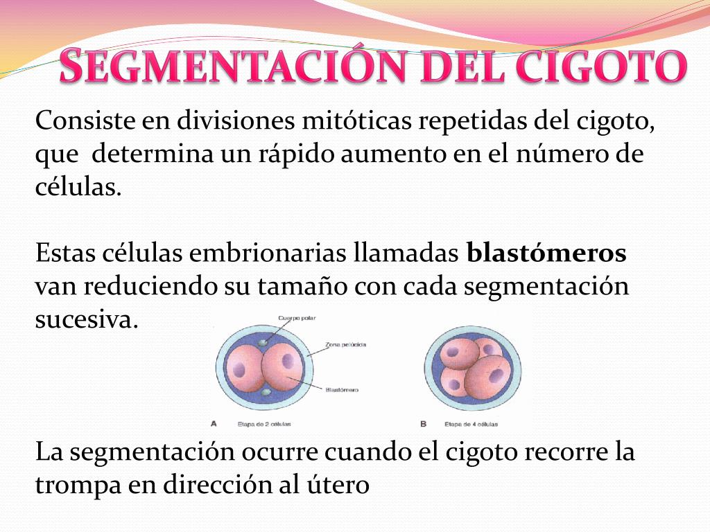 SEGMENTACIÓN DEL CIGOTO Consiste en divisiones mitóticas repetidas del cigoto, que determina un rápido aumento en el número de células. Estas células embrionarias llamadas blastómeros van reduciendo su tamaño con cada segmentación sucesiva. La segmentación ocurre cuando el cigoto recorre la trompa en dirección al útero