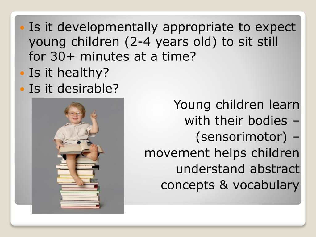 Is it developmentally appropriate to expect young children (2-4 years old) to sit still for 30+ minutes at a time? • Is it healthy? • Is it desirable? Young children learn with their bodies – (sensorimotor) – movement helps children understand abstract concepts & vocabulary