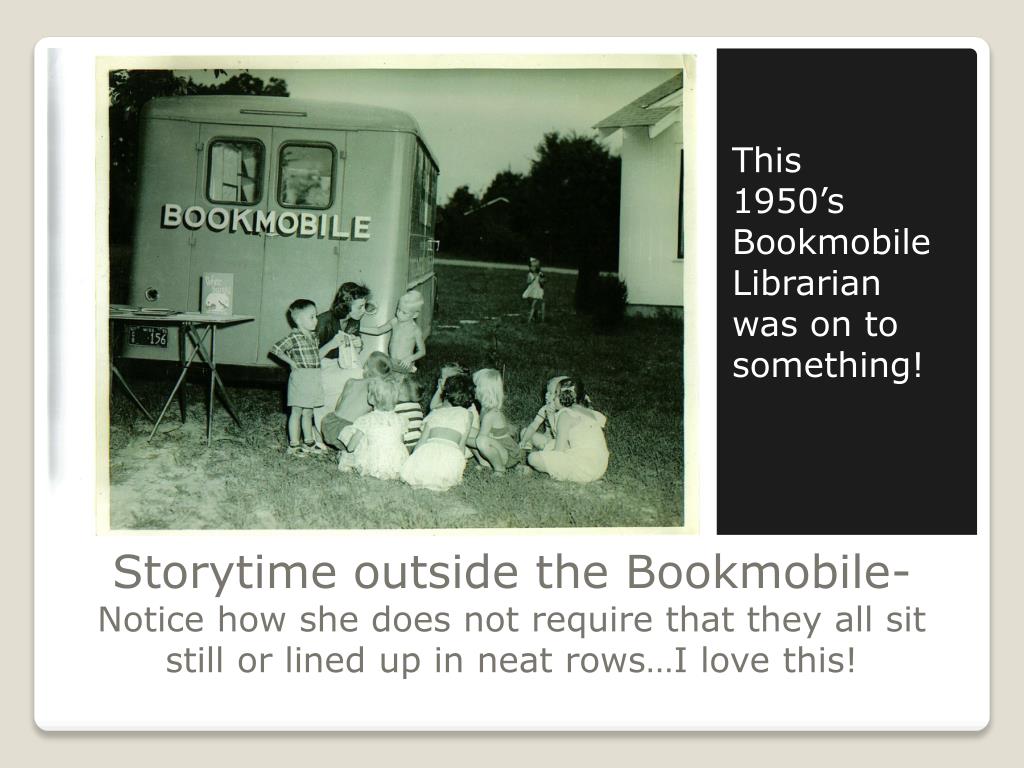 This 1950’s Bookmobile Librarian was on to something! Storytime outside the Bookmobile-Notice how she does not require that they all sit still or lined up in neat rows…I love this!