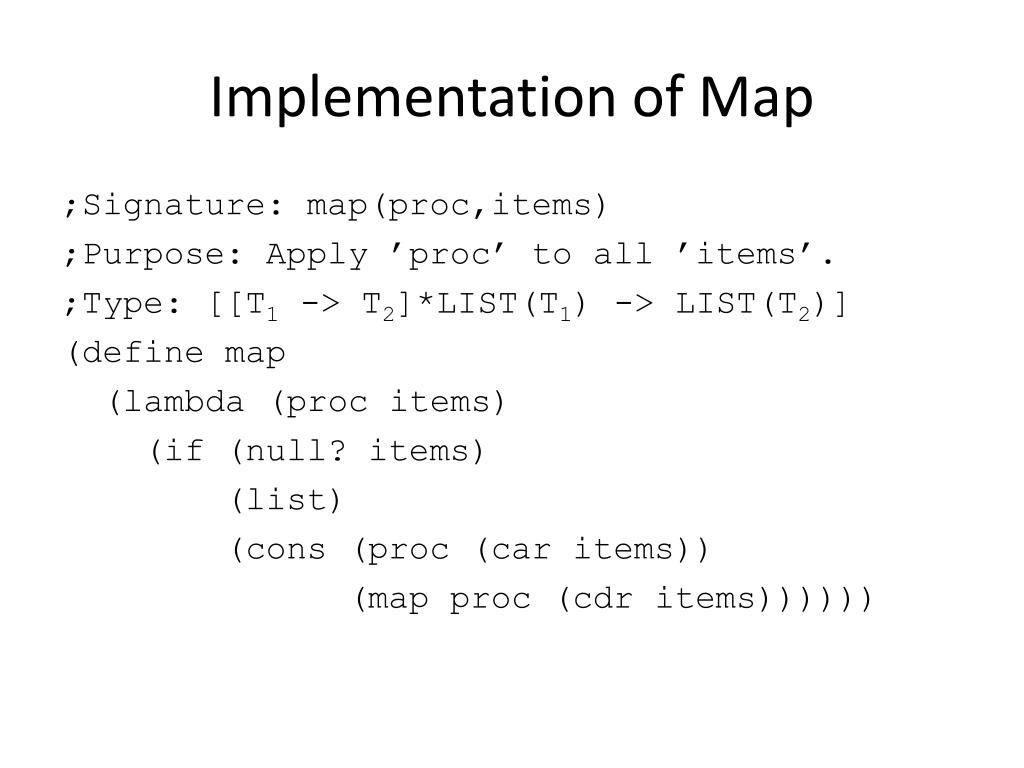 Implementation of Map ;Signature: map(proc,items) ;Purpose: Apply ’proc’ to all ’items’. ;Type: [[T1 -> T2]*LIST(T1) -> LIST(T2)] (define map (lambda (proc items) (if (null? items) (list) (cons (proc (car items)) (map proc (cdr items))))))