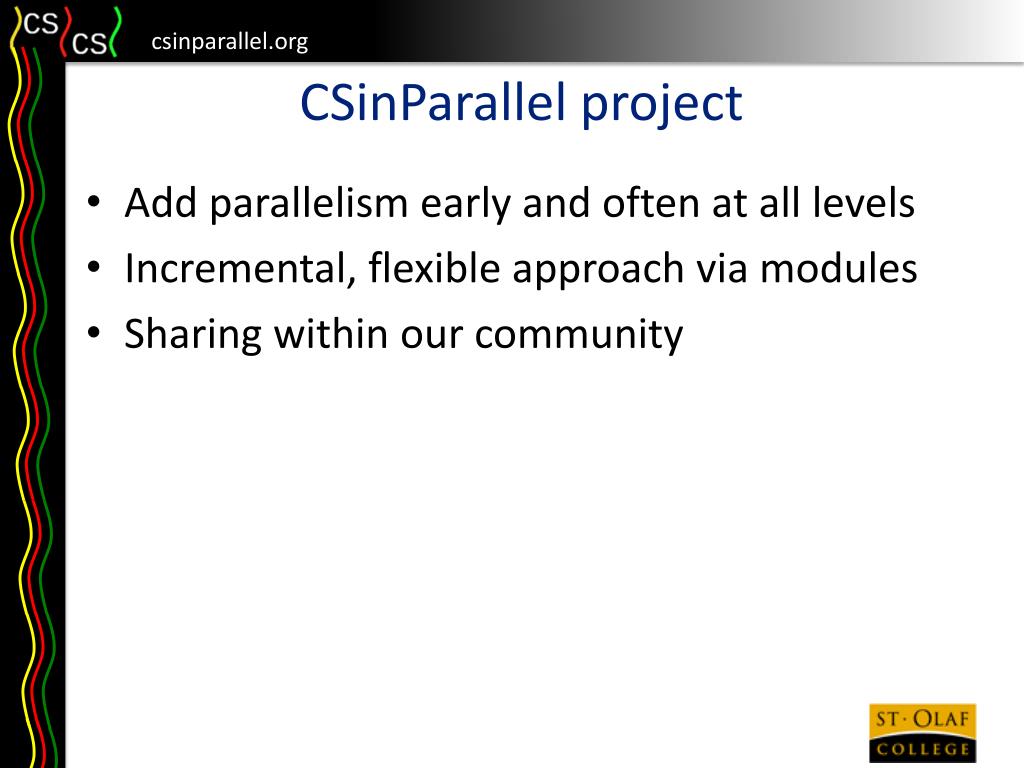 CSinParallel project • Add parallelism early and often at all levels • Incremental, flexible approach via modules • Sharing within our community