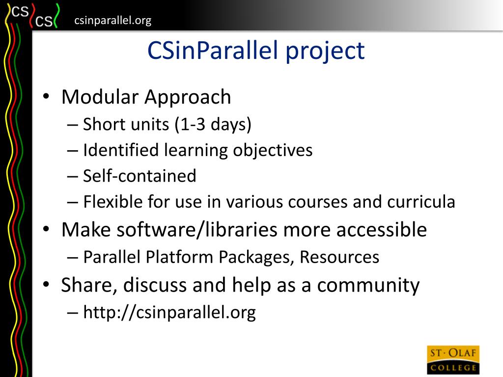 CSinParallel project • Modular Approach • Short units (1-3 days) • Identified learning objectives • Self-contained • Flexible for use in various courses and curricula • Make software/libraries more accessible • Parallel Platform Packages, Resources • Share, discuss and help as a community • http://csinparallel.org