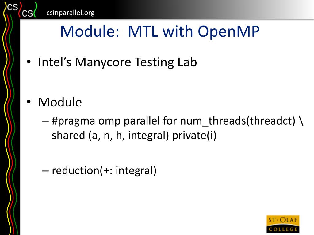 Module: MTL with OpenMP • Intel’s Manycore Testing Lab • Module • #pragma omp parallel for num_threads(threadct) \shared (a, n, h, integral) private(i) • reduction(+: integral)