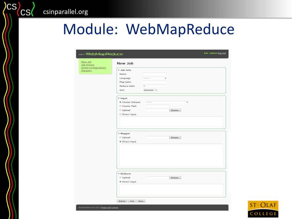 CSinParallel project Some selected module topics • Introductory: • Map-Reduce computing for CS1 using WebMapReduce • Concurrent access to data structures in Java or C++ • Multicore programming with Intel’s Manycore Testing Lab • Intermediate: • Introduction to parallel computing concepts • Concurrency strategies in programming languages • Parallel sorting algorithms