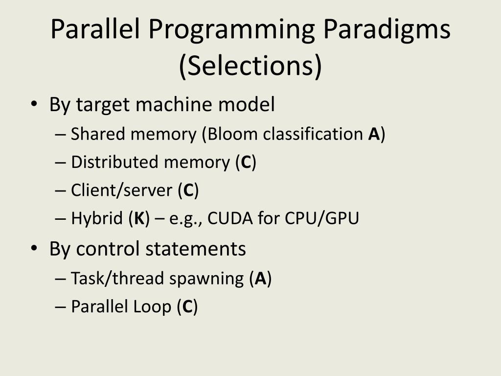 Parallel Programming Paradigms (Selections) • By target machine model • Shared memory (Bloom classification A) • Distributed memory (C) • Client/server (C) • Hybrid (K) – e.g., CUDA for CPU/GPU • By control statements • Task/thread spawning (A) • Parallel Loop (C)