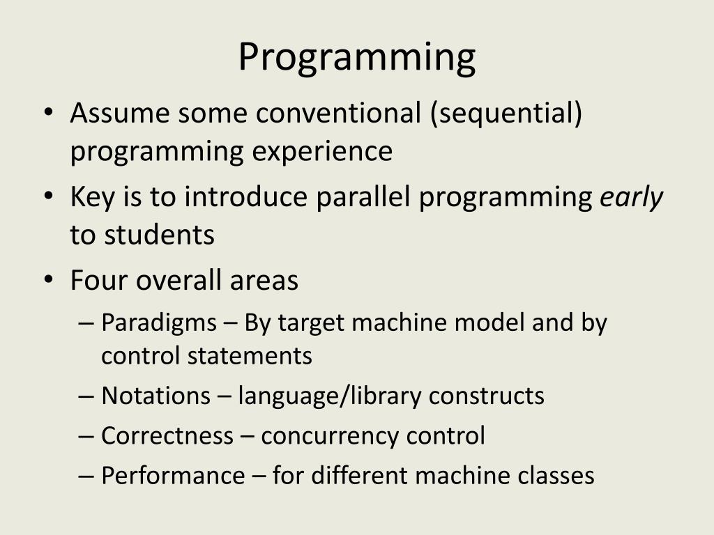 Programming • Assume some conventional (sequential) programming experience • Key is to introduce parallel programming early to students • Four overall areas • Paradigms – By target machine model and by control statements • Notations – language/library constructs • Correctness – concurrency control • Performance – for different machine classes
