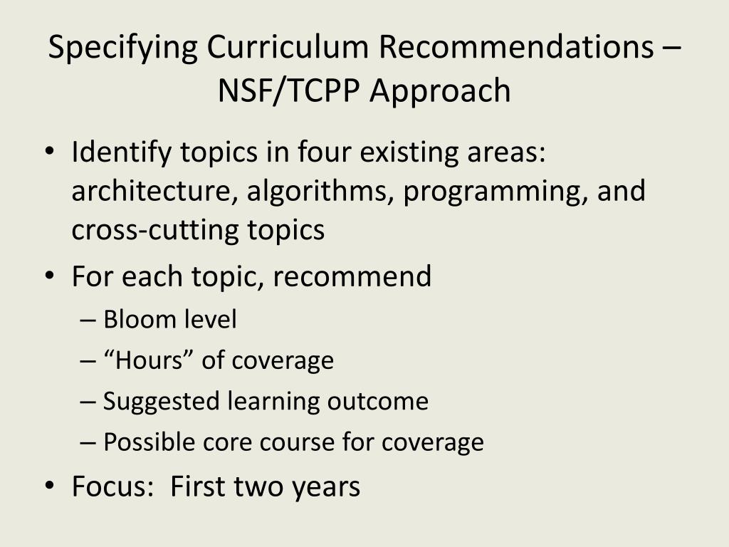 Specifying Curriculum Recommendations – NSF/TCPP Approach • Identify topics in four existing areas: architecture, algorithms, programming, and cross-cutting topics • For each topic, recommend • Bloom level • “Hours” of coverage • Suggested learning outcome • Possible core course for coverage • Focus: First two years