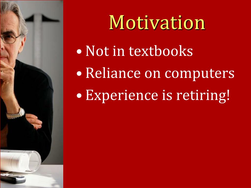 Motivation • Not in textbooks • Reliance on computers • Experience is retiring!