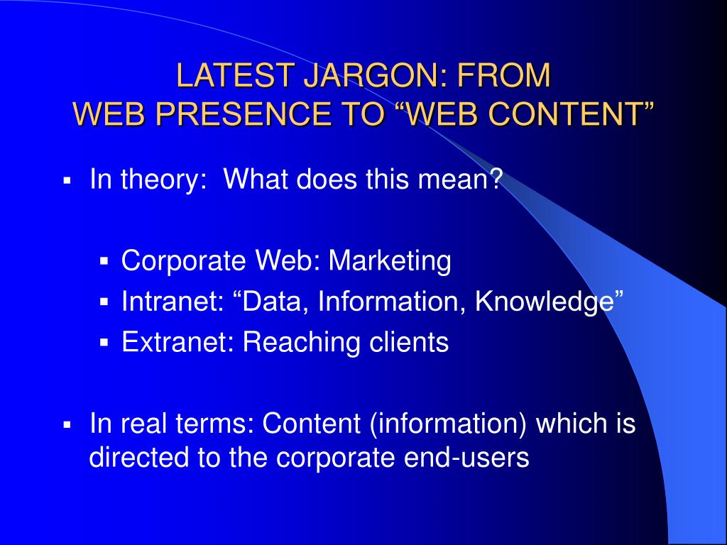LATEST JARGON: FROM WEB PRESENCE TO “WEB CONTENT” • In theory: What does this mean? • Corporate Web: Marketing • Intranet: “Data, Information, Knowledge” • Extranet: Reaching clients • In real terms: Content (information) which is directed to the corporate end-users