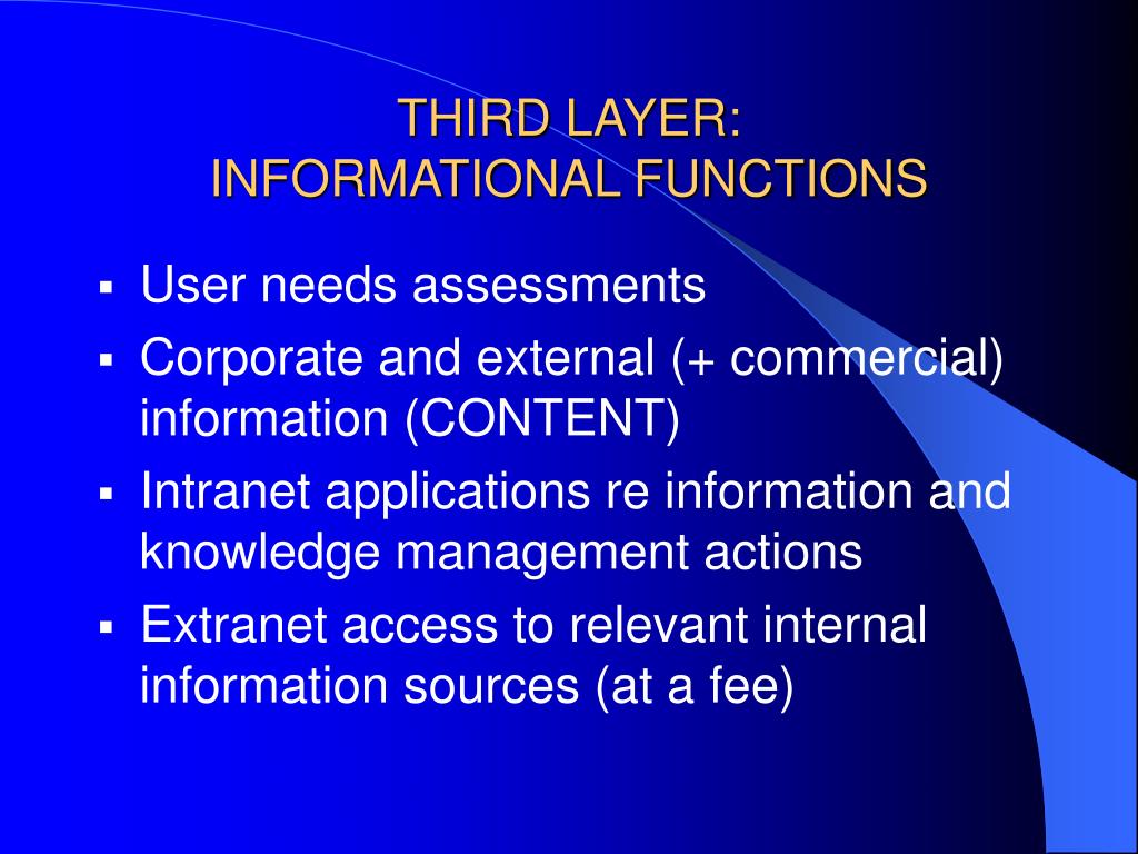 THIRD LAYER:INFORMATIONAL FUNCTIONS • User needs assessments • Corporate and external (+ commercial) information (CONTENT) • Intranet applications re information and knowledge management actions • Extranet access to relevant internal information sources (at a fee)